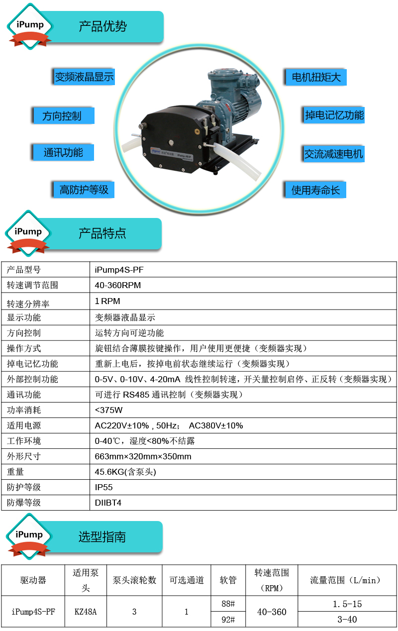 1.流量范圍:1.5-40L/min 2.彈性壓管結構,軟管壽命長,非常適合大流量液體傳輸 3.免維護交流減速電機驅動,變頻器調節轉速 4.全金屬泵頭,高精度,更可靠 5.防爆等級DIIBT4,適合易燃易爆環境使用